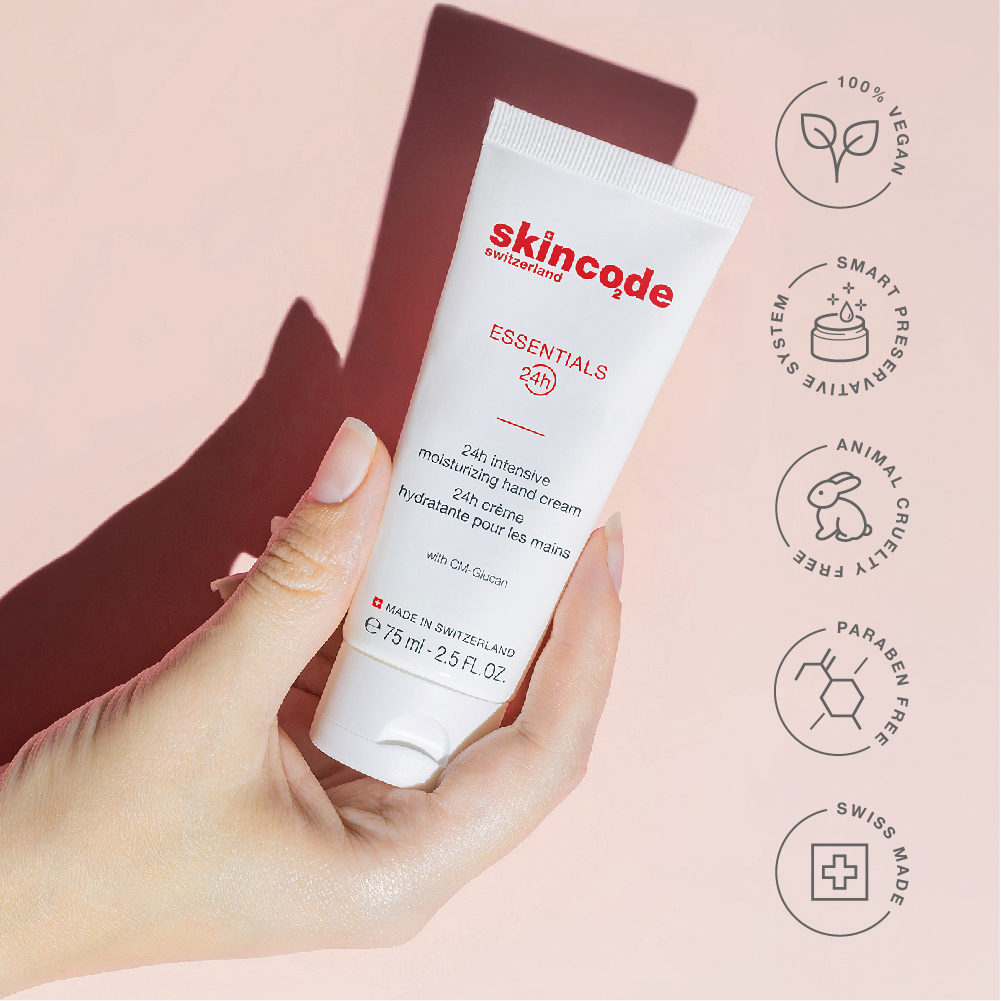 The 24h Intensive Moisturizing Hand Cream is part of Skincode's Essentials 24h collection. The Skincode Essentials 24h collection is an everyday skincare range for all skin types, including sensitized skin in need of intensive care. All 24h products are formulated with specially selected high performing active ingredients, suitable for even the most sensitive skin, to help restore health and balance to the skin.
