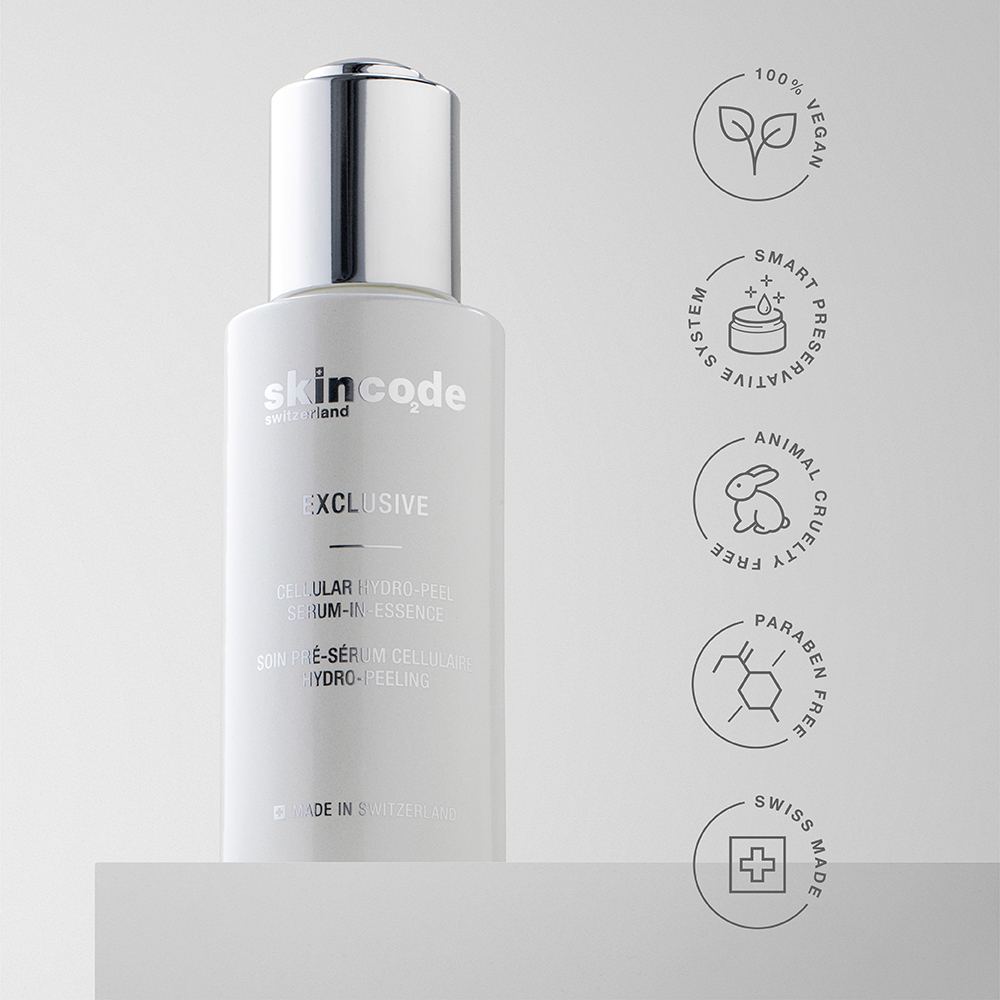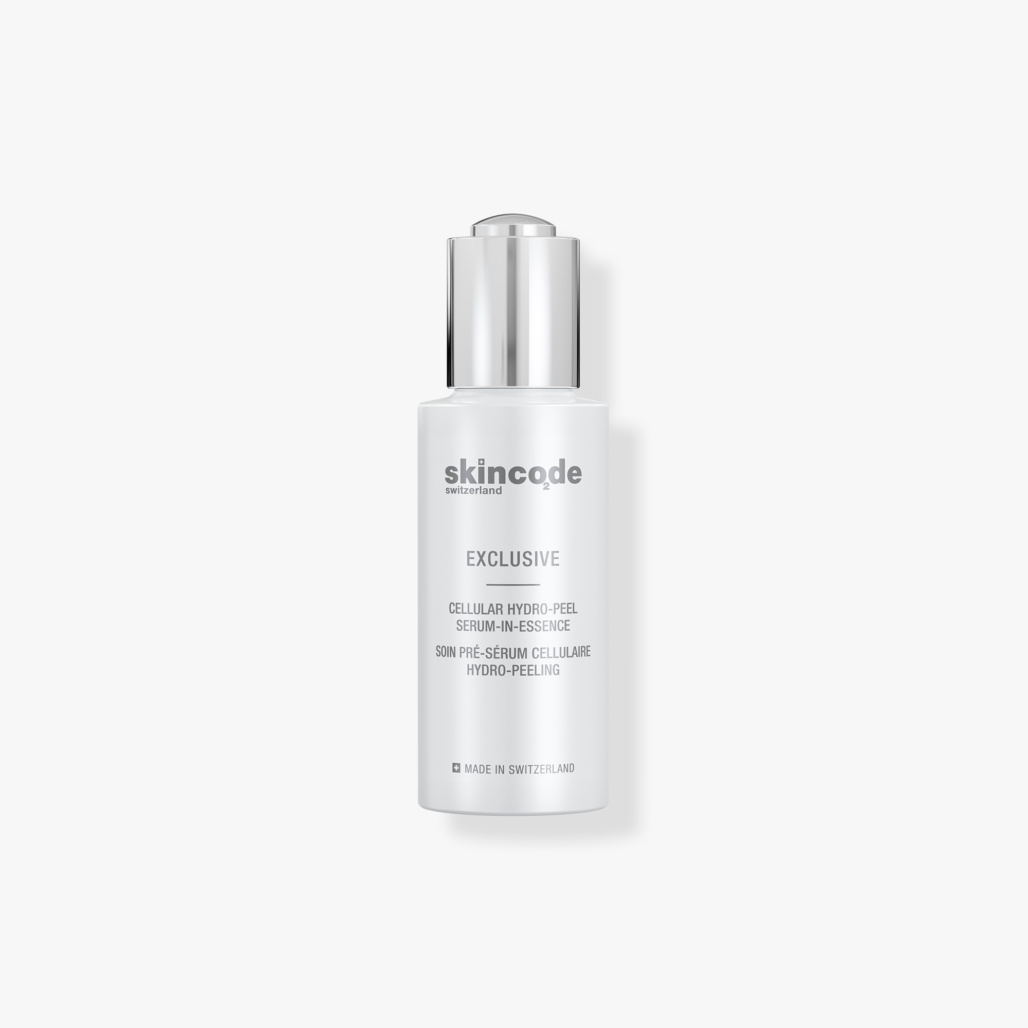 The Cellular Hydro-Peel Serum-in-Essence is part of Skincode's Exclusive collection. Skincode Exclusive is a luxury-oriented, revolutionary Swiss cellular anti-aging skincare line designed to address the specific needs of mature skin. The powerful anti-aging treatments speed up the cell renewal process and increase collagen production, which slow with age.