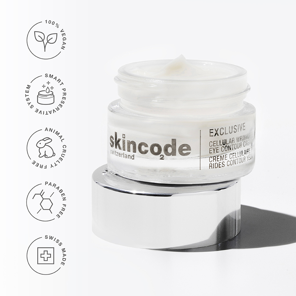 The Cellular Wrinkle Prohibiting Eye Contour Cream is part of Skincode's Exclusive collection. Skincode Exclusive is a luxury-oriented, revolutionary Swiss cellular anti-aging skincare line designed to address the specific needs of mature skin. The powerful anti-aging treatments speed up the cell renewal process and increase collagen production, which slow with age.