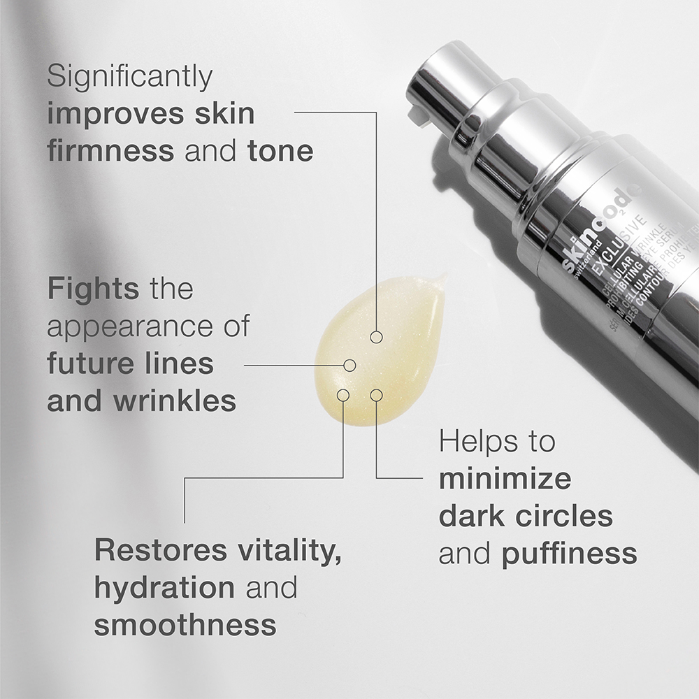 The Cellular Wrinkle Prohibiting Eye Serum is part of Skincode's Exclusive collection. Skincode Exclusive is a luxury-oriented, revolutionary Swiss cellular anti-aging skincare line designed to address the specific needs of mature skin. The powerful anti-aging treatments speed up the cell renewal process and increase collagen production, which slow with age.