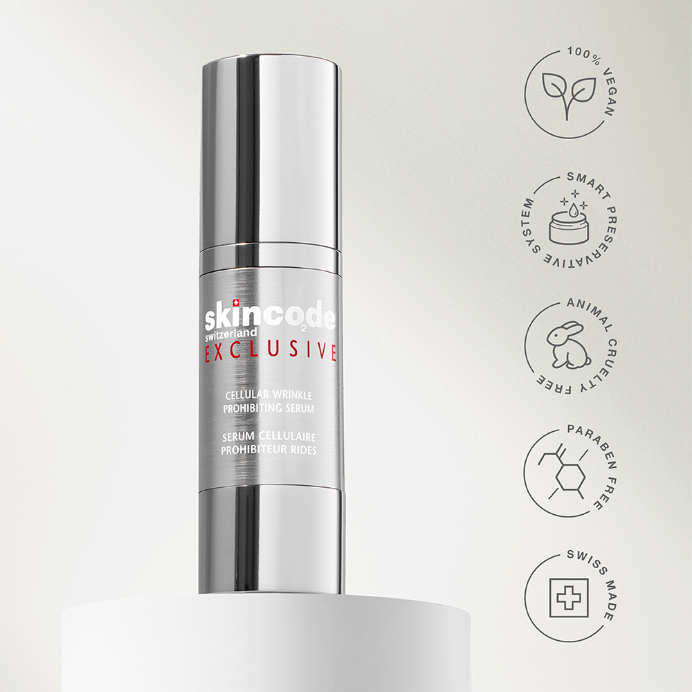 The Cellular Wrinkle Prohibiting Serum is part of Skincode's Exclusive collection. Skincode Exclusive is a luxury-oriented, revolutionary Swiss cellular anti-aging skincare line designed to address the specific needs of mature skin. The powerful anti-aging treatments speed up the cell renewal process and increase collagen production, which slow with age.